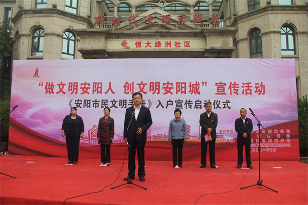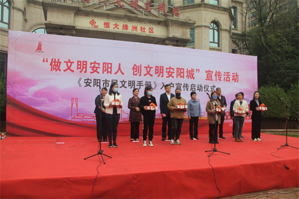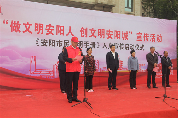 儀式上,公司志愿者李俊峰代表北關(guān)區(qū)志愿者進行“爭做文明市民”宣誓,市衛(wèi)健委陳美紅代表文明單位表態(tài)發(fā)言,薛崇林、張玲、李志弘、車俊朝、路錄平、王洪忠為市、區(qū)各單位代表發(fā)放《安陽市民文明手冊》。