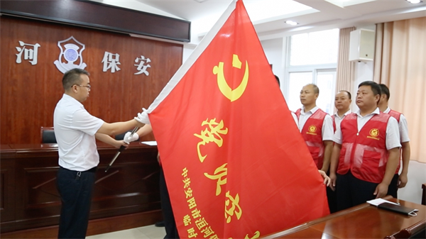 會上,公司黨委副書記、監(jiān)事長張錫軍宣讀關(guān)于成立臨時(shí)黨支部的決定。下沉干部臨時(shí)黨支部書記馮文峰作表態(tài)發(fā)言,表示要發(fā)揚(yáng)臨時(shí)黨支部戰(zhàn)斗堡壘作用,發(fā)揮黨員先鋒模范作用,堅(jiān)決完成黨委交給的任務(wù)。接著,王高峰為下沉干部臨時(shí)黨支部授旗。全體下沉干部對著鮮艷的黨旗莊嚴(yán)宣誓:我志愿加入黨員突擊隊(duì),堅(jiān)決做到服從命令、聽從指揮,排除萬難、不怕犧牲,齊心協(xié)力,勇克難關(guān),為洹河保安爭光添彩。
