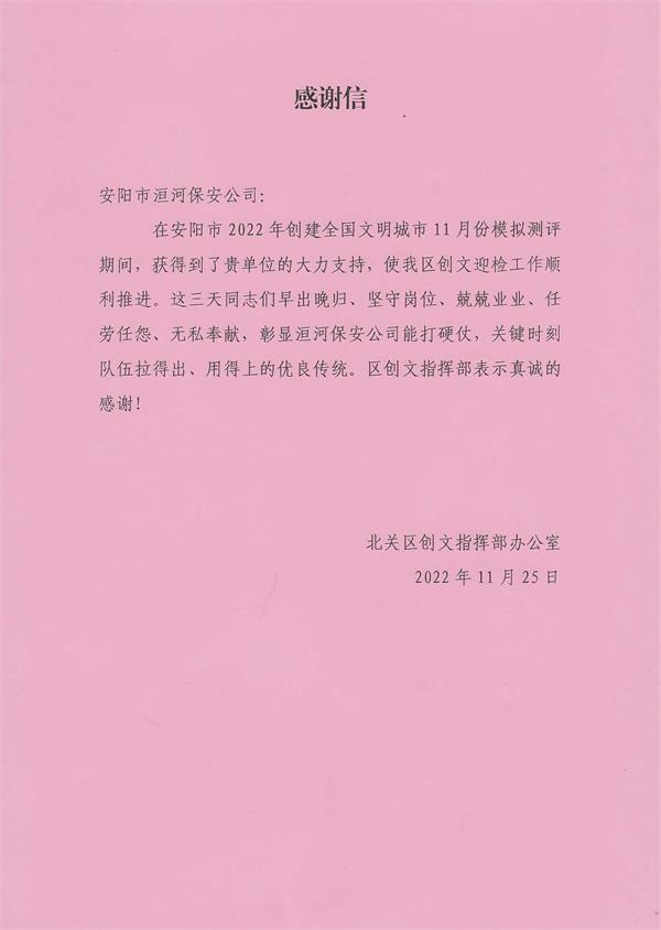 此次,志愿者們?cè)诜?wù)中增強(qiáng)了社會(huì)責(zé)任感,以實(shí)際行動(dòng)圓滿完成了我市文明城市創(chuàng)建任務(wù),同時(shí)北關(guān)區(qū)創(chuàng)文指揮部發(fā)來(lái)表?yè)P(yáng)信,表?yè)P(yáng)公司在安陽(yáng)市創(chuàng)文模擬測(cè)評(píng)期間做出的貢獻(xiàn)。彰顯了洹河保安公司能打硬仗,關(guān)鍵時(shí)刻隊(duì)伍拉得出、用得上的優(yōu)良傳統(tǒng),展示了洹河保安公司作為新創(chuàng)省級(jí)文明單位的責(zé)任擔(dān)當(dāng)和奉獻(xiàn)精神。