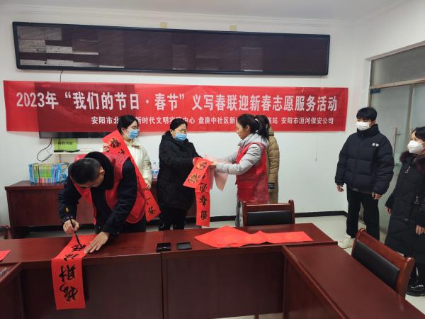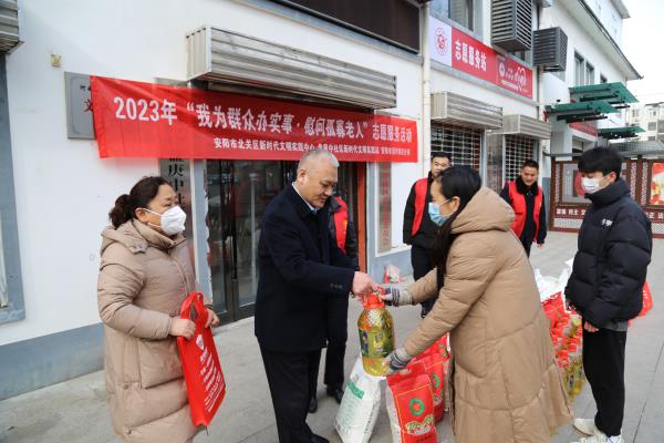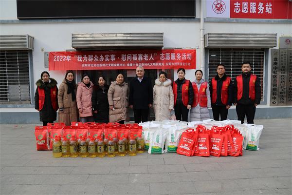 為進(jìn)一步了解基層群眾的需求,切實(shí)解決他們?cè)谏钪械膶?shí)際問題,讓他們度過一個(gè)溫暖、祥和、快樂的新春佳節(jié)。1月17日下午,公司總經(jīng)理魏東帶領(lǐng)志愿者帶著米、面、油、春聯(lián)等深入盤庚中社區(qū)開展了“義寫春聯(lián)迎新春”暨“我為群眾辦實(shí)事慰問孤寡老人”志愿服務(wù)活動(dòng)。