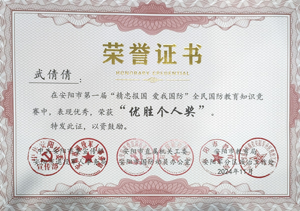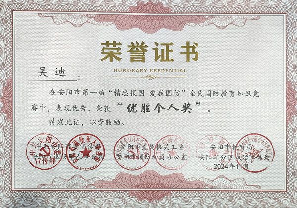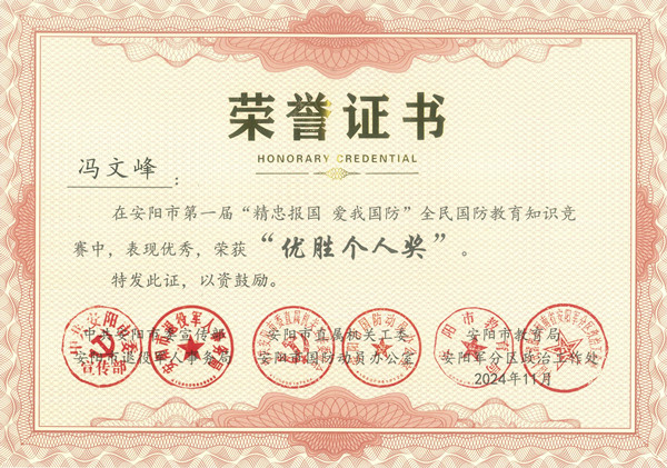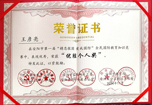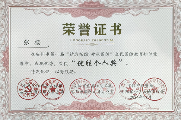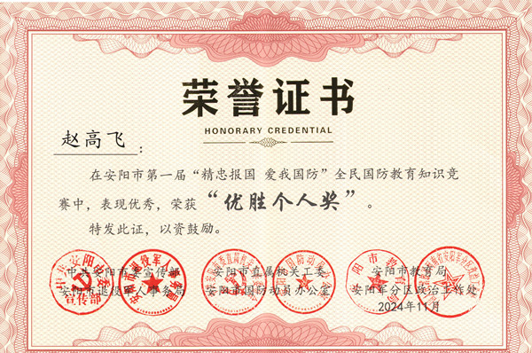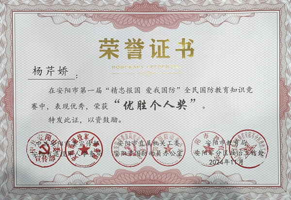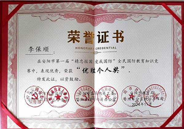 近日,安陽市第一屆“精忠報國 愛我國防”全民國防教育知識競賽圓滿落幕,公司馮文峰、李保順、王彥亮、趙高飛、張揚、楊芹嬌、吳迪、武倩倩等8名同志榮獲“優(yōu)勝個人獎”。