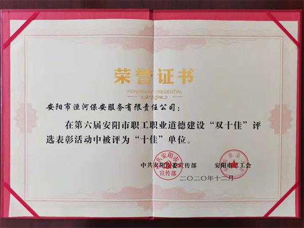 為深入學(xué)習(xí)貫徹習(xí)近平新時代中國特色社會主義思想和黨的十九大精神,積極踐行社會主義核心價值觀,進一步提升職工職業(yè)道德建設(shè)水平,為決勝全面建成小康社會,加快實現(xiàn)“一個重返、六個重大”目標任務(wù),建設(shè)新時代區(qū)域性中心強市作出新的更大貢獻,日前,經(jīng)安陽市“雙十佳”評委會評審,中共安陽市委宣傳部、安陽市總工會決定:授予安陽市洹河保安服務(wù)有限責(zé)任公司“安陽市職業(yè)道德建設(shè)十佳單位”榮譽稱號。