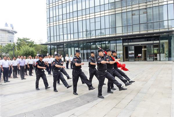 這隊(duì)特保隊(duì)員是人防一大隊(duì)駐聯(lián)通公司中隊(duì)特保隊(duì)員。只見(jiàn)4名標(biāo)兵著裝整齊,正步走向預(yù)定位置;3名護(hù)旗手在6名隊(duì)員護(hù)送下步伐整齊的走向升旗臺(tái)。護(hù)旗手上臺(tái)掛旗動(dòng)作嫻熟,伴隨著高昂的國(guó)歌,五星紅旗冉冉升起,全體參與人員向國(guó)旗敬禮。此刻,上升的不僅有國(guó)旗,還有全體黨員干部職工對(duì)黨和國(guó)家的熱愛(ài)和自豪感、愛(ài)國(guó)愛(ài)黨情懷。
