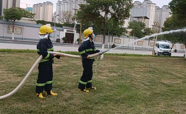 隨后,特保隊員現(xiàn)場進(jìn)行了處置火險演練。演練過程中,隊員按照預(yù)案,發(fā)現(xiàn)初期火險后,立即組織人員疏散,穿上防火衣,拿起消防帶,打開閥門,放水滅火,同時實施報警……