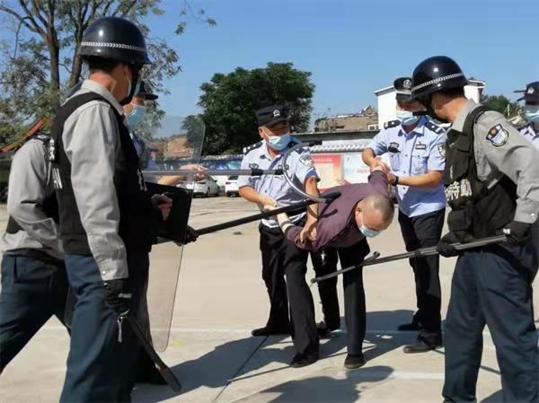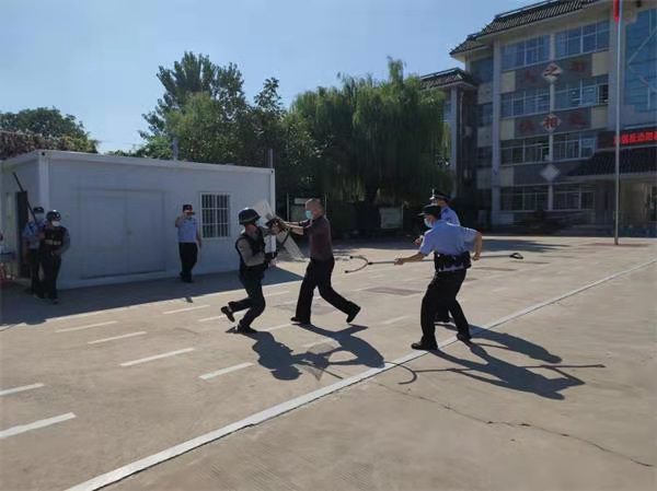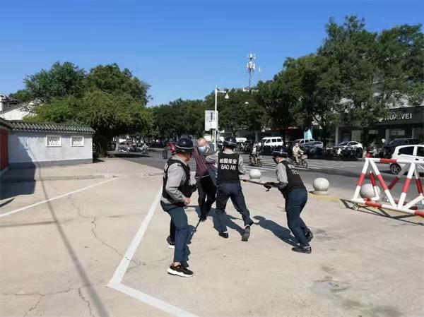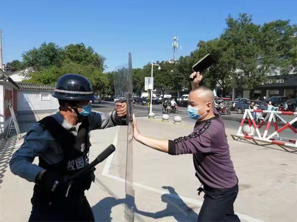 一名“恐暴”分子到學校門崗尋釁滋事,與門崗保安隊員發(fā)生沖突,暴徒手持菜刀闖進校園。學校兩名保安手持鋼叉、盾牌與恐暴分子發(fā)生對峙,另一名保安按響了一健報警裝置,110指揮中心接到報警后,立即出動警力趕赴現(xiàn)場,學校保安和民警協(xié)同作戰(zhàn),成功將闖入校園的暴恐“歹徒”制服。整個演練過程緊湊、嚴肅逼真,受到了學校和派出所領(lǐng)導的表揚。