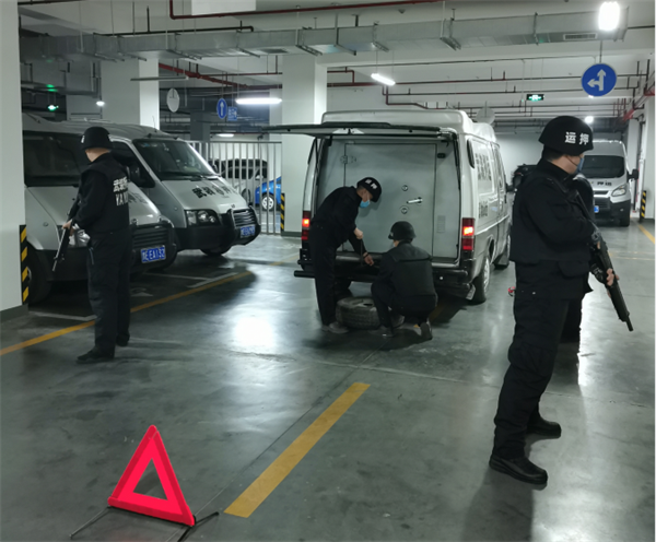 演練現(xiàn)場(chǎng),一輛運(yùn)鈔車(chē)在執(zhí)行押運(yùn)勤務(wù)途中突發(fā)故障,車(chē)組人員沉著冷靜、反應(yīng)迅速、措施得當(dāng),整個(gè)過(guò)程按照應(yīng)急預(yù)案有序進(jìn)行,達(dá)到預(yù)期效果。