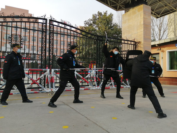 上午9時(shí)30分,在疫情防控期間,兩名社會(huì)人員不戴口罩要強(qiáng)行進(jìn)入安陽(yáng)第五中學(xué)校園,保安員對(duì)其進(jìn)行勸阻。但兩人不聽勸告,手持鋼管要沖進(jìn)學(xué)校,并揚(yáng)言用爆炸物威脅。我保安員立刻啟動(dòng)防暴防恐應(yīng)急預(yù)案。隊(duì)員拿起鋼叉、橡膠棒、防暴盾牌等安保器械與“暴徒”勇敢的搏斗,逐步壓縮暴恐分子活動(dòng)范圍,并在工學(xué)院中隊(duì)的配合下將兩人制服。