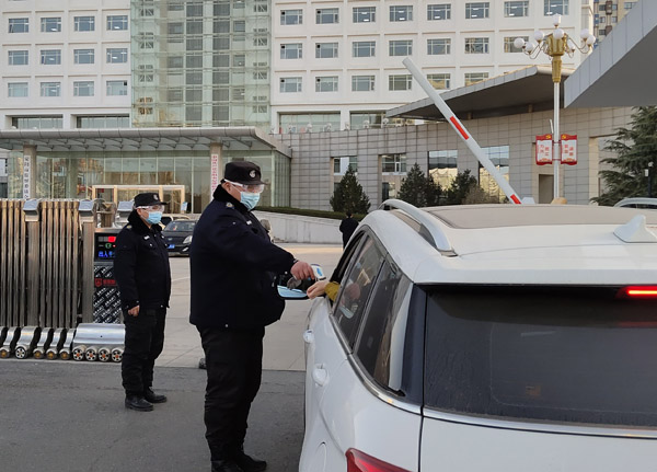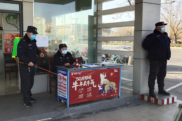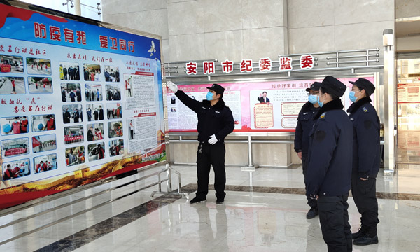 目前,中隊(duì)全體隊(duì)員表示,要以飽滿的工作熱情積極工作,保障客戶安全,為客戶度過一個平安祥和的春節(jié)做出自己的貢獻(xiàn)。圖為隊(duì)員在學(xué)習(xí)疫情防控知識、對崗點(diǎn)進(jìn)行消殺、測量外來人員體溫。