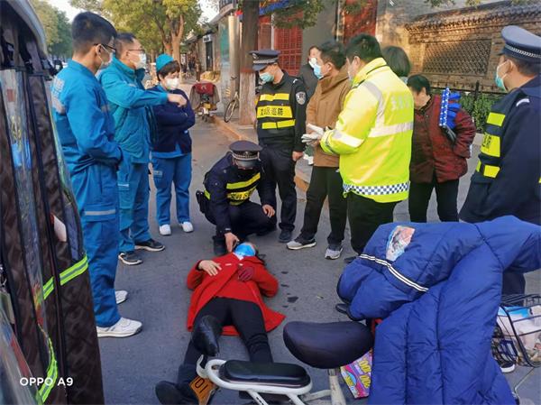 早上7點50分許,巡防隊員王軍清、梁子力,完成學校護校崗安保任務后,在返回單位途中,發(fā)現(xiàn)文峰北路與三道街交叉口車輛行駛極其緩慢,造成道路擁堵。王軍清立即下車查看,原來是一輛轎車與一輛電動車發(fā)生碰撞,導致電動車側(cè)翻倒地,一名約70歲的老人摔倒在地,見此情形,執(zhí)勤隊員連忙上前詢問查看,發(fā)現(xiàn)該老人表情痛苦,外觀有輕微傷。