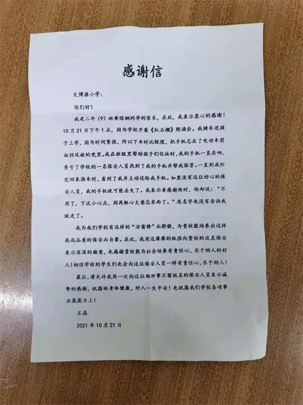 10 月21 日下午1點(diǎn),該校二年級(jí)(9)班黃煜嫻的家長王晶帶孩子來校參加《紅石榴》朗誦會(huì)。慌忙之中,下車時(shí)不慎把手機(jī)忘在了電動(dòng)車前面擋風(fēng)被的兜里,便匆匆進(jìn)了學(xué)校。因忙于幫助孩子們化妝,王晶根本想不起手機(jī)的事。后來她的手機(jī)一直在響,正在門口執(zhí)勤的保安員趙海利循聲找到手機(jī),便幫她保管了起來。待王晶忙完回來推車時(shí),趙海利主動(dòng)把手機(jī)交給了她。因?yàn)榇箝T外人行道過往的人很多,要不是這名保安給她把手機(jī)保管起來,肯定是找不回來了。王晶驚喜之余,表示要感謝他時(shí),趙海利善意提醒道:“不用了,下次小心點(diǎn),別再粗心大意忘東西了。”說完便忙他的去了。