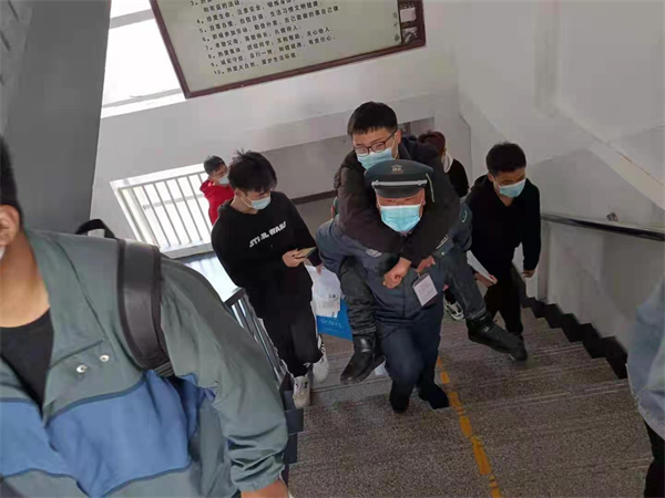 10月30日上午9點(diǎn),在安陽市第八中學(xué)教師資格證考試入場前,看到一位校園保安將一名考生從一樓背上四樓,在場的考生、監(jiān)考老師對這位校園保安的舉動嘖嘖稱贊。