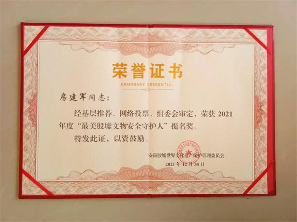 2021年12月31日上午,殷墟管委會在殷都區(qū)政府南三樓舉行“最美殷墟文物安全守護人”頒獎暨“殷墟”官網(wǎng)開通慶典儀式。人防二大隊駐龍安殷墟文物安全網(wǎng)格巡邏隊房建軍同志獲得“最美殷墟文物安全守護人”提名獎,受到龍安殷墟文物安全網(wǎng)格化管理工作簡報通報表揚,安陽殷墟世界文化遺產(chǎn)保護管理委員會頒發(fā)了榮譽證書。