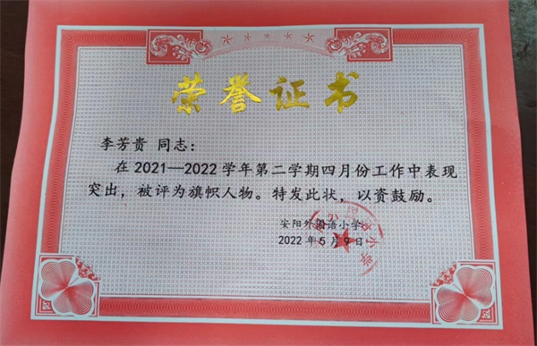 在疫情防控常態(tài)化背景下,校門管控是校園疫情防控的第一道防線,是疫情防控工作的重點部位,校園保安在校門守衛(wèi)持久戰(zhàn)中扮演著舉足輕重的角色。今年4月份以來,安陽市內(nèi)疫情多點散發(fā),為確保校園的安全穩(wěn)定,李芳貴堅守崗位,在校園內(nèi)開展全方位的消毒防疫和隱患排查工作,定期檢查水電消防,做到發(fā)現(xiàn)隱患及時處置,確保校園疫情防控及安全工作做實做好,承擔起守護校園疫情防控第一道防線的重大責任,在四月份總結(jié)評比中被安陽外國語小學評為旗幟人物。