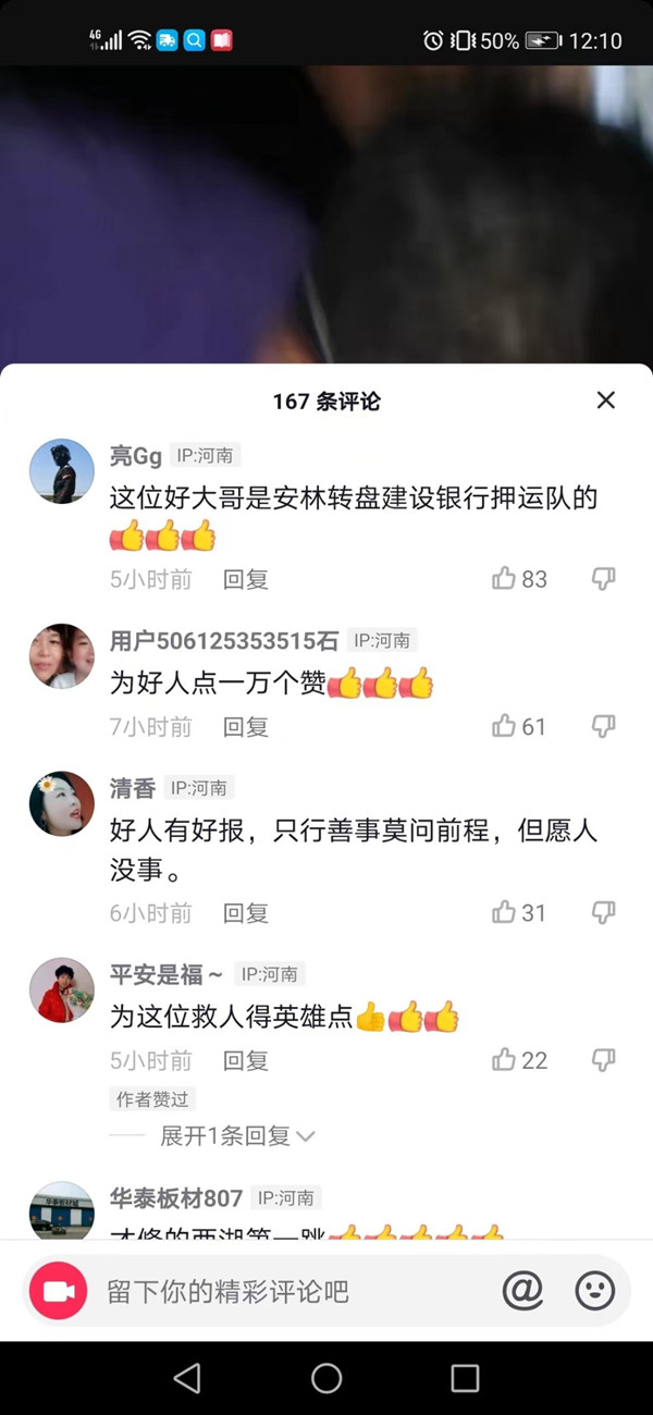 6月6日晚10時(shí)30分左右,韓海根、劉玉峰、張彩軍、徐現(xiàn)強(qiáng)等四人下班后前往林州龍湖散步遛彎。當(dāng)行至涼亭下面時(shí),他們聽(tīng)見(jiàn)“撲通”的落水聲,韓海根隱約看到附近的一位紅衣女子跳下了龍湖,他們借著夜色發(fā)現(xiàn)該女子在水里掙扎,此時(shí),韓海根、劉玉峰、張彩軍、徐現(xiàn)強(qiáng)四人迅速趕到落水點(diǎn)查看情況,旁邊已經(jīng)有路人在圍觀,但卻沒(méi)人下去營(yíng)救,此時(shí),隊(duì)員徐現(xiàn)強(qiáng)立即跳下去前去營(yíng)救,韓海根、劉玉峰、張彩軍打開(kāi)手機(jī)電源為其進(jìn)行照明指揮,經(jīng)過(guò)大家的努力,成功將落水女子救了上來(lái)。此時(shí)有路人已經(jīng)撥打了120和報(bào)警電話,救護(hù)車趕到后,四人合力又將落水女子抬上了救護(hù)車,路邊的群眾紛紛為其四人的行為點(diǎn)贊,并被路邊群眾拍攝視頻上傳到了抖音上,贊揚(yáng)他們弘揚(yáng)了社會(huì)正氣,傳遞了社會(huì)正能量,為四人的挺身而出和俠義之舉點(diǎn)贊。