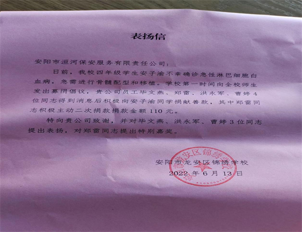 6月13日,錦繡學(xué)校四年級(jí)學(xué)生安子渝不幸確診急性淋巴細(xì)胞白血病,急需進(jìn)行骨髓配型和移植。學(xué)校第一時(shí)間向全校師生發(fā)出募捐倡議,人防四大隊(duì)駐學(xué)校員工畢文燕、鄭雷、洪永軍、曹月婷 4位同志得到消息后積極向安子渝同學(xué)捐獻(xiàn)善款,其中鄭雷同志積極主動(dòng)二次捐款110元。錦繡學(xué)校得知情況后提出對(duì)畢文燕、洪永軍、曹月婷進(jìn)行表?yè)P(yáng),對(duì)鄭雷特別嘉獎(jiǎng),向洹河公司發(fā)來(lái)表?yè)P(yáng)信。