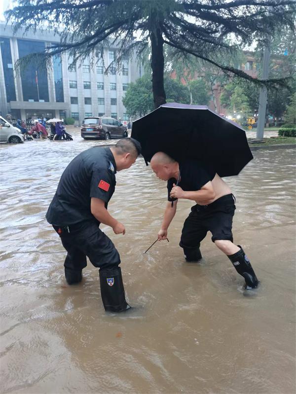7月5日下午,安陽區(qū)域突遭暴雨襲擊 ,城市道路內(nèi)澇嚴(yán)重,人防一大隊(duì)駐中國銀行保安班全力以赴確??蛻魡挝婚T前道路暢通。