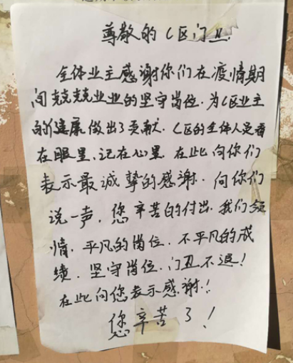 第六天,帕堤歐小區(qū)的一位住戶說“平日里,我們對(duì)保安的工作沒有特別在意,這次疫情期間,我看到了保安真是少不了?。 睘榇?,這里的業(yè)主在2月16日下午,聯(lián)名給保安寫了一封感謝信。感謝他們?yōu)闃I(yè)主的健康,為小區(qū)的平安,作出的貢獻(xiàn)。