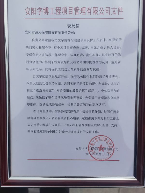 表?yè)P(yáng)信中寫道,自文字續(xù)建項(xiàng)目運(yùn)營(yíng)開始,公司駐點(diǎn)全體安保隊(duì)員認(rèn)真負(fù)責(zé),盡心盡力做好文字博物館的安保及外圍公園管理治安秩序維護(hù)工作。尤其是在大型活動(dòng)期間,全體安保人員履職盡責(zé),堅(jiān)持安全第一,既保證了活動(dòng)現(xiàn)場(chǎng)安全無事故,也保障了參觀游客分流秩序維護(hù),圓滿完成各項(xiàng)任務(wù),得到各方領(lǐng)導(dǎo)的高度認(rèn)可。