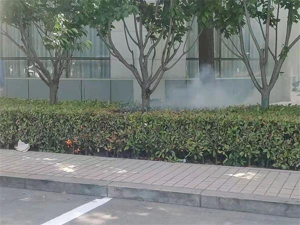 5月1日下午13點(diǎn)45分許,黨政大樓隊員苗沖沖巡邏到餐廳時發(fā)現(xiàn)綠化冒起濃煙,并冒起火苗,苗沖沖立即用對講報告班長趙彬彬。趙彬彬在接到火情后,迅速操起兩個滅火器趕到現(xiàn)場,和苗沖沖一起把火撲滅,避免了珍貴樹種被燒死和草坪被大面積燒毀。據(jù)分析,火情是由于抽煙者未掐滅而隨手丟棄煙頭引起的。