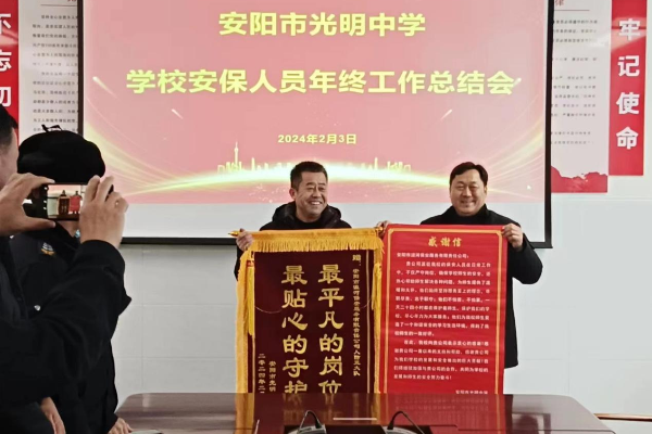 2024年2月3日,在安陽市光明中學(xué)年終工作總結(jié)會(huì)上,學(xué)校領(lǐng)導(dǎo)將一面印有“最平凡的崗位、最貼心的守護(hù)”的錦旗送到人防三大隊(duì)副大隊(duì)長(zhǎng)劉慶剛手中,并致信表揚(yáng),感謝人防三大隊(duì)駐安陽市光明中學(xué)保安班對(duì)維護(hù)校園安全以及校園周邊治安秩序做出的積極努力和貢獻(xiàn)。