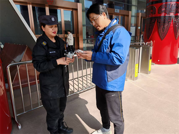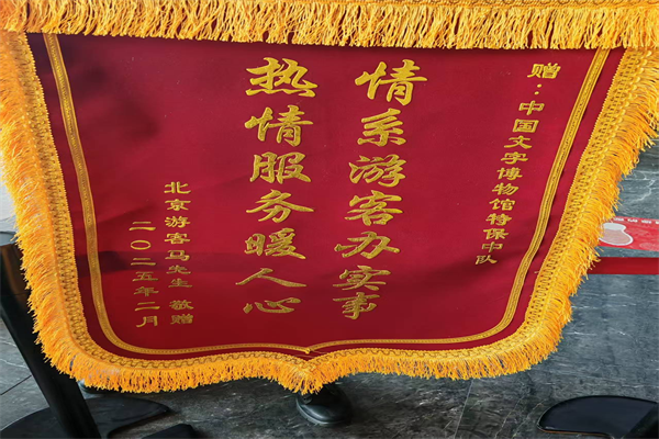 2月16日,一名北京游客將一面“情系游客辦實事 熱情服務暖人心”的錦旗送到特保大隊派駐中國文字博物館特保中隊,表達對特保隊員不顧恐高、幫助找到墜落無人機的感激之情。