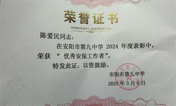 3月6日下午,安陽(yáng)市第九中學(xué)舉行2024年度工作表彰大會(huì),人防三大隊(duì)派駐該校保安員陳愛(ài)民獲得“優(yōu)秀安保工作者”榮譽(yù)稱(chēng)號(hào)。