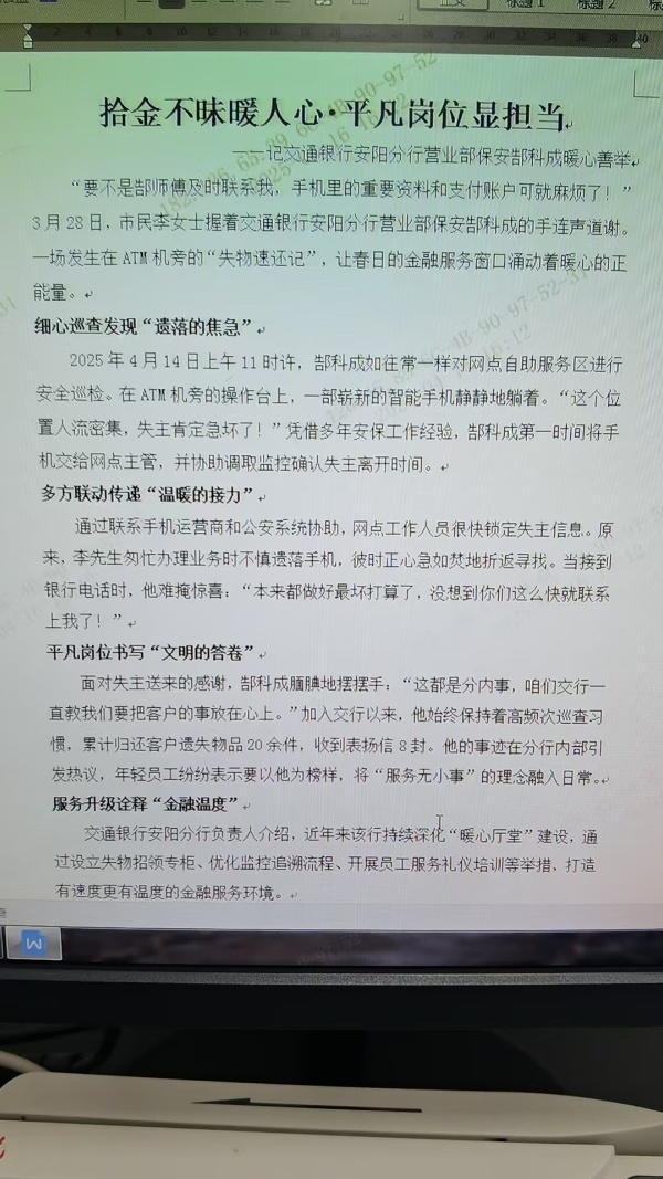 近日,交通銀行股份有限公司安陽分行以《拾金不昧暖人心·平凡崗位顯擔(dān)當(dāng)--記交通銀行安陽分行營業(yè)部保安郜科成暖心善舉》為題在安陽分行內(nèi)部網(wǎng)站發(fā)表文章,對技防分公司保安隊員郜科成給予高度贊揚(yáng)。