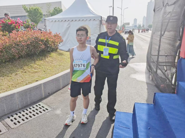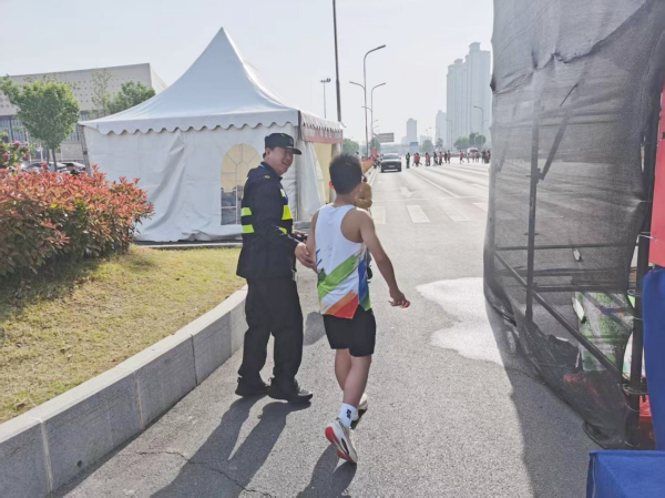 4月26日上午,安陽馬拉松比賽如火如荼。在比賽現(xiàn)場,一名走失兒童在執(zhí)勤人員幫助下順利回到家人身邊。