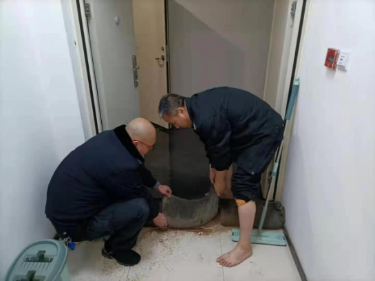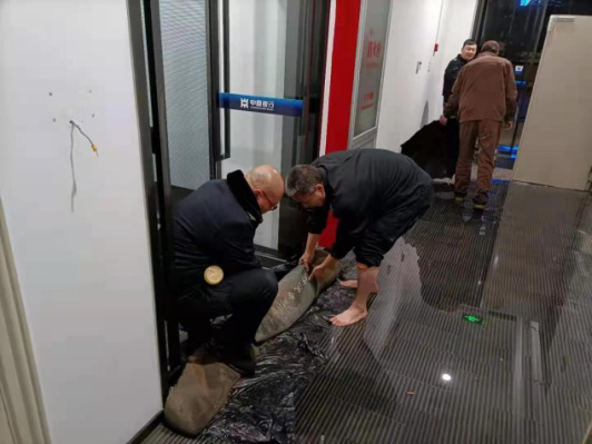 看到水還在通過破裂的管道不斷涌出,辦公室和走廊已經(jīng)有了積水,已經(jīng)危及到辦公用品的安全。值班隊(duì)員不顧寒冷,立即行動(dòng)起來,與中原銀行物業(yè)人員投入搶險(xiǎn)。隊(duì)員趙紅、王勇一方面把已經(jīng)有積水的辦公室中的物品搬運(yùn)出來,另一方面迅速用沙袋擋在辦公室門口,阻止流水進(jìn)入,并用掃把等工具清理積水;趙紅更是脫掉鞋,光著腳,泡在寒冷刺骨的水中,清理積水,減少損失。物業(yè)人員則從管道破裂處,接上臨時(shí)管道把水引向樓外。經(jīng)過一個(gè)小時(shí)的奮戰(zhàn),辦公室和樓道內(nèi)的積水終被清理完畢。