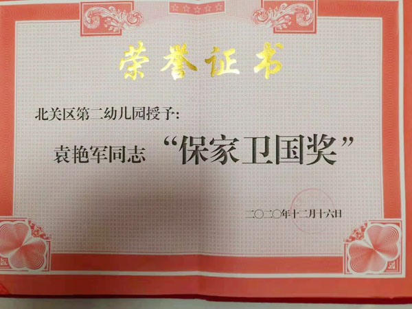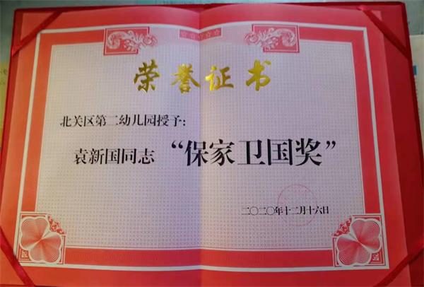 在北關(guān)區(qū)第二幼兒園園慶暨2020年表彰會(huì)上,兩名同志被園方授予“保家衛(wèi)國”榮譽(yù)稱號(hào)。二人表示,在新的一年里,一定不辜負(fù)領(lǐng)導(dǎo)的厚愛與期望,不忘宗旨使命,認(rèn)真履行職責(zé),為構(gòu)建平安幼兒園和抗擊疫情貢獻(xiàn)自己的力量。