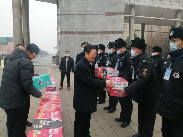 1月15日上午,安陽(yáng)工學(xué)院校長(zhǎng)景國(guó)勛一行,帶著方便面、蘋果、橘子等慰問品,來到人防三大隊(duì)派駐工學(xué)院保安班駐地慰問堅(jiān)守在一線執(zhí)勤的隊(duì)員。人防三大隊(duì)領(lǐng)導(dǎo)王武魁、聶紹軍、閆永勝參加了慰問活動(dòng)。