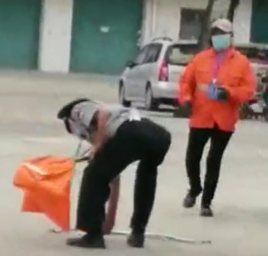 下午2點40許,保潔車經(jīng)過4號門,路面不平,工具掉落地上,人防二大隊王紅軍喊停環(huán)衛(wèi)人員,幫其撿起清潔工具。