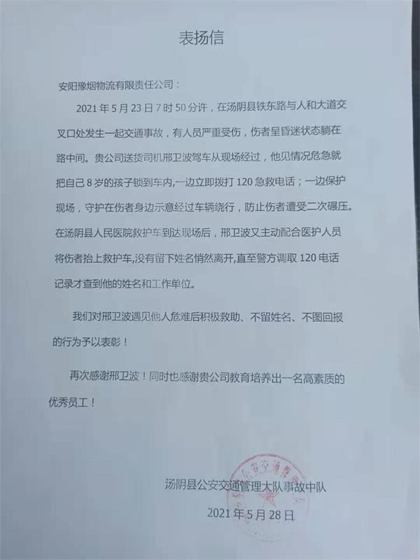 據(jù)悉,6月3日下午,湯陰縣公安交通管理大隊(duì)事故中隊(duì)工作人員曾帶著一封表揚(yáng)信來到安陽豫煙物流公司,感謝邢衛(wèi)波,對(duì)邢衛(wèi)波見義勇為,積極救助傷者的行為予以表揚(yáng)。