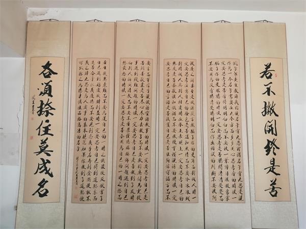 杜先生家大門朝東,坐落在村東一處較為平緩的崗地,頗具靜水流深、紫氣東來(lái)之神韻。這里儼然是一處天然氧吧,門前開闊地東側(cè),是一片蔥郁的樹林,林中不知名的鳥兒發(fā)出歡快的叫聲,好像和主人一起歡迎客人的到來(lái)。我們隨主人進(jìn)院來(lái)到北屋,一股書香氣撲面而來(lái),正門墻上一組行書四扇屏字畫映入眼簾,上書孔子老先生教誨的九思,兩側(cè)是一副醒目的對(duì)聯(lián):若不撇開終是苦,各須捺住莫成名。