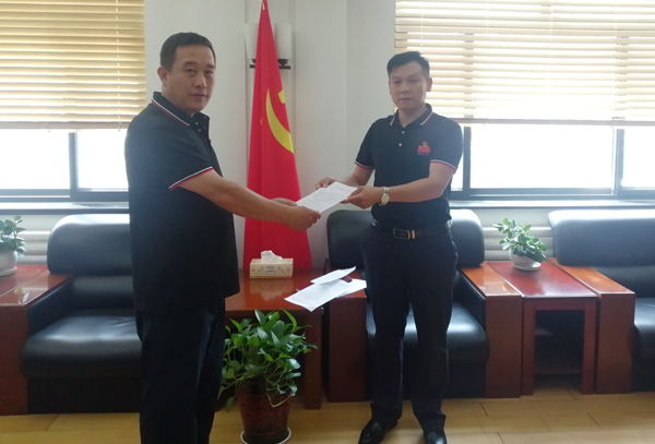 圖為黨員在向支部書記遞交入黨申請書。